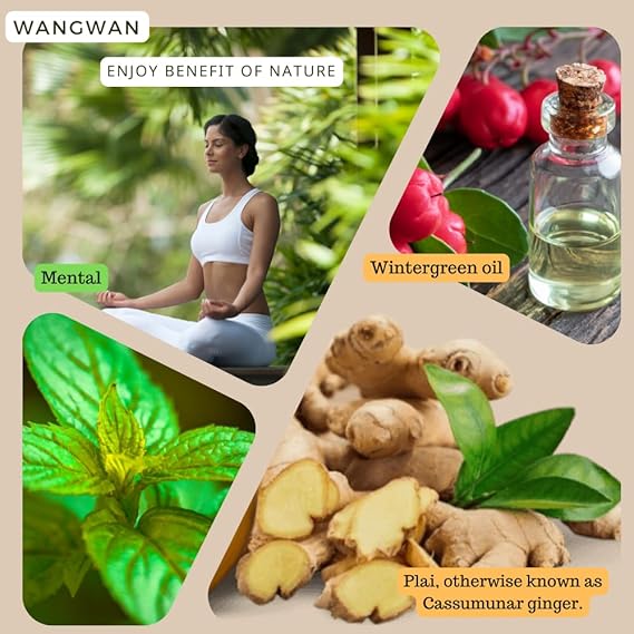 Wang Wan Spray bottle Strong Flavor and Best Seller Unlike any other balms that is used for inhaling, Wangprom herbal wax is used to apply on skin with painful areas. It will leave a deep warming and soothing touch which is great for warming up your muscle tensions. Wang Wan herbal wax is packed with blended natural Thai herbs. Easily absorbed, not sticky, leaving no film residue on the skin. Made from high quality raw materials Packed with concentrated plai oil.