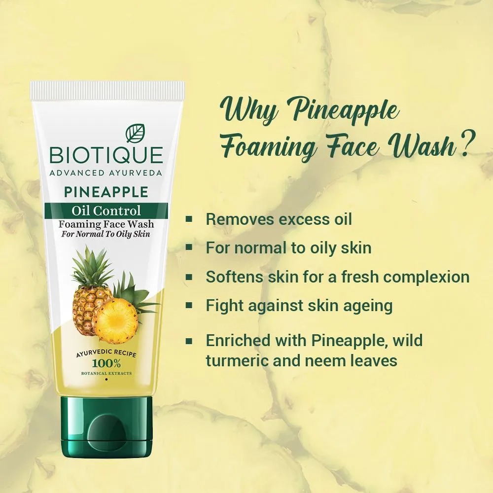 - Key benefits: This soap-free biotique pineapple face wash helps soften skin and fights ageing. It clears away excess oil and helps calm inflammation.