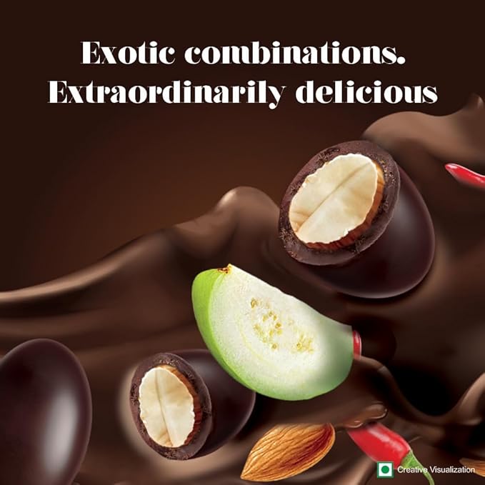 - Dive into the world of Indulgence Indulge in an intriguing combination of dark cocoa rich chocolate and exotic fruit flavors like Roasted California Almond seasoned with Guava & Mexican Chili.