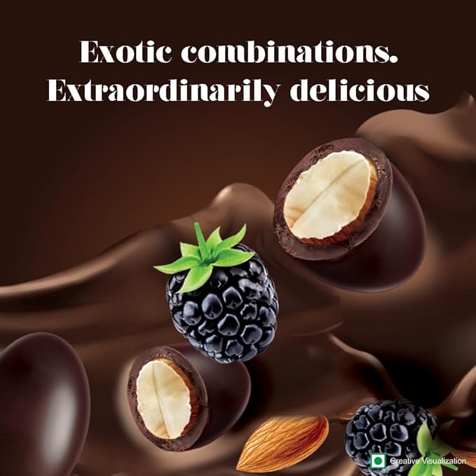 - Dive into the world of Indulgence Indulge in roasted Californian Almonds sprinkled with exotic flavours of Blackberry, coated in dark cocoa rich chocolate.