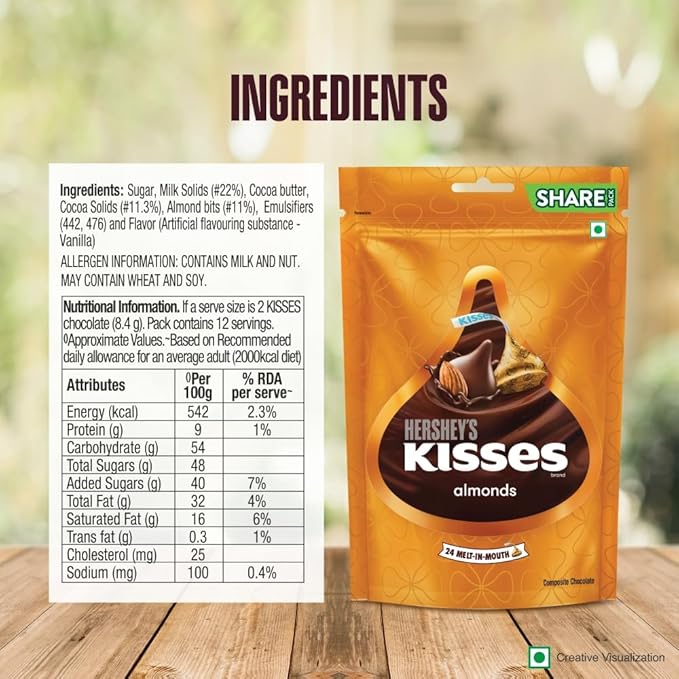 Further, anyone with food allergies, dietary restrictions, or certain medical condition(s) should check all food packaging & labels of Hersheys Kisses Almonds Chocolate 100.8 g to meet their health needs.