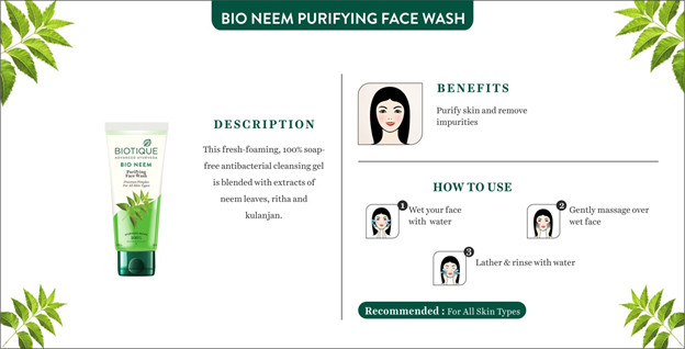 - Key Benefit: The neem face wash gently washes away the impurities while keeping the skin squeaky clean and clear. The use of natural ingredients clarifies the pores and gives a naturally pimple free skin.